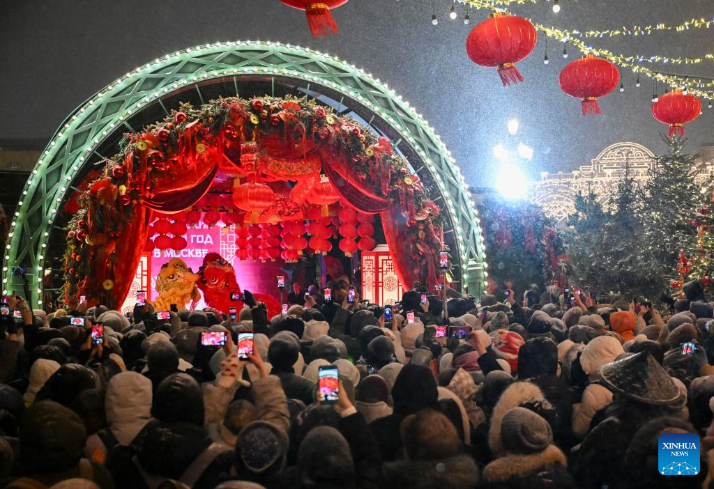 Visitors watch a lion dance performance during the opening ceremony of celebrations for the Chinese New Year in Moscow, Russia, Feb. 16, 2026. (Xinhua/Hao Jianwei)