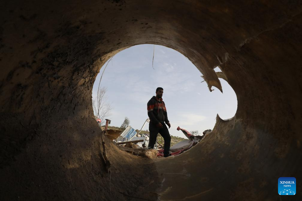 A Palestinian inspects the damage after an Israeli excavator demolished a car repair shop in south of Nablus in the West Bank, Feb. 16, 2026. (Photo by Nidal Eshtayeh/Xinhua)
