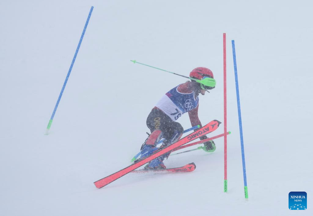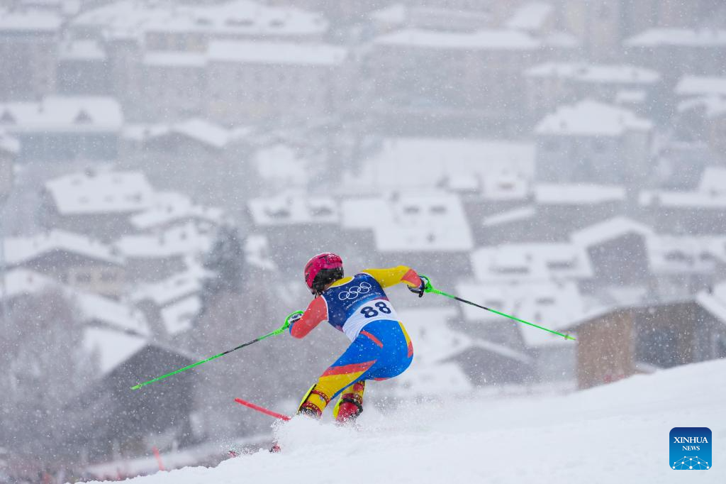 Ariunbat Altanzul of Mongolia competes during the alpine skiing men's slalom event at the Milan-Cortina 2026 Olympic Winter Games in Bormio, Italy, Feb. 16, 2026. (Xinhua/Hu Huhu)