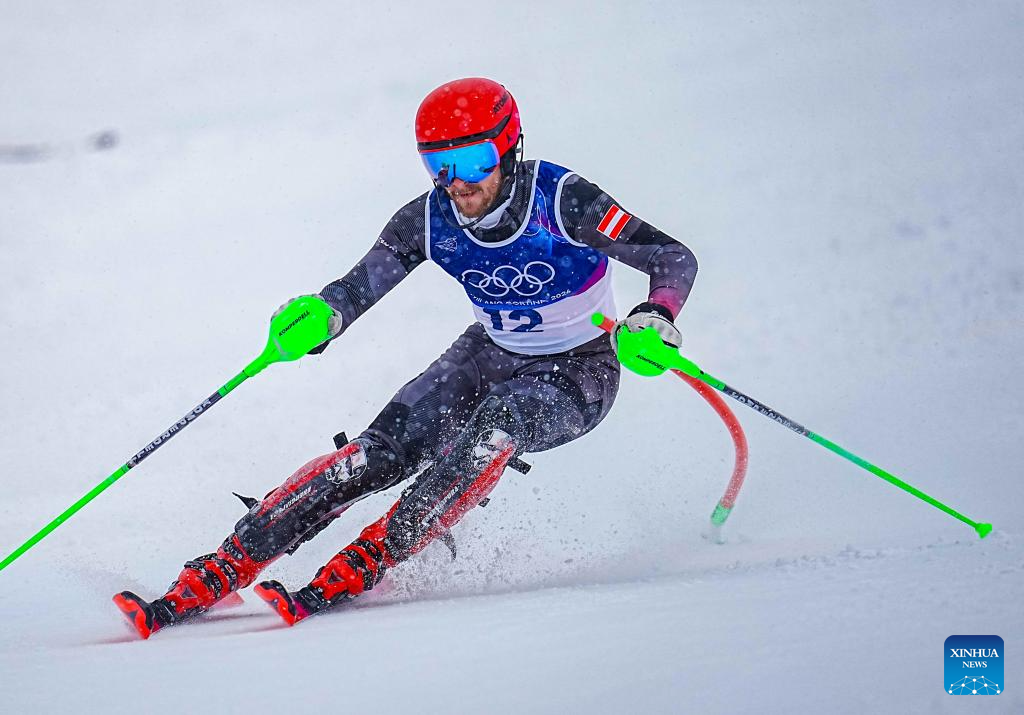 Fabio Gstrein of Austria competes during the alpine skiing men's slalom event at the Milan-Cortina 2026 Olympic Winter Games in Bormio, Italy, Feb. 16, 2026. (Xinhua/Yan Linyun)