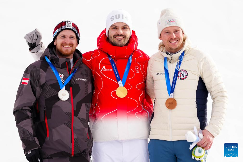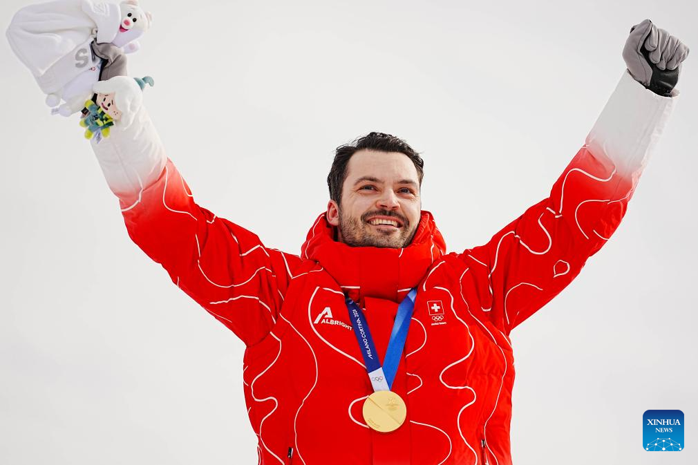 Loic Meillard of Switzerland poses for photos during the awarding ceremony of the alpine skiing men's slalom event at the Milan-Cortina 2026 Olympic Winter Games in Bormio, Italy, Feb. 16, 2026. (Xinhua/Yan Linyun)