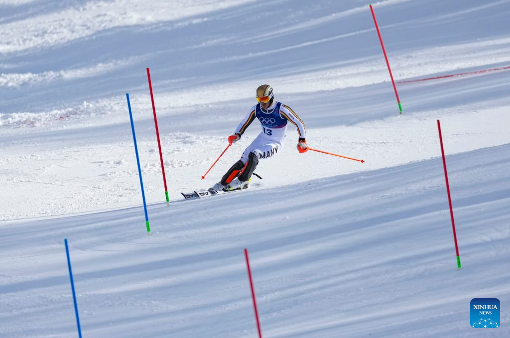 Linus Strasser of Germany competes during the alpine skiing men's slalom event at the Milan-Cortina 2026 Olympic Winter Games in Bormio, Italy, Feb. 16, 2026. (Xinhua/Hu Huhu)