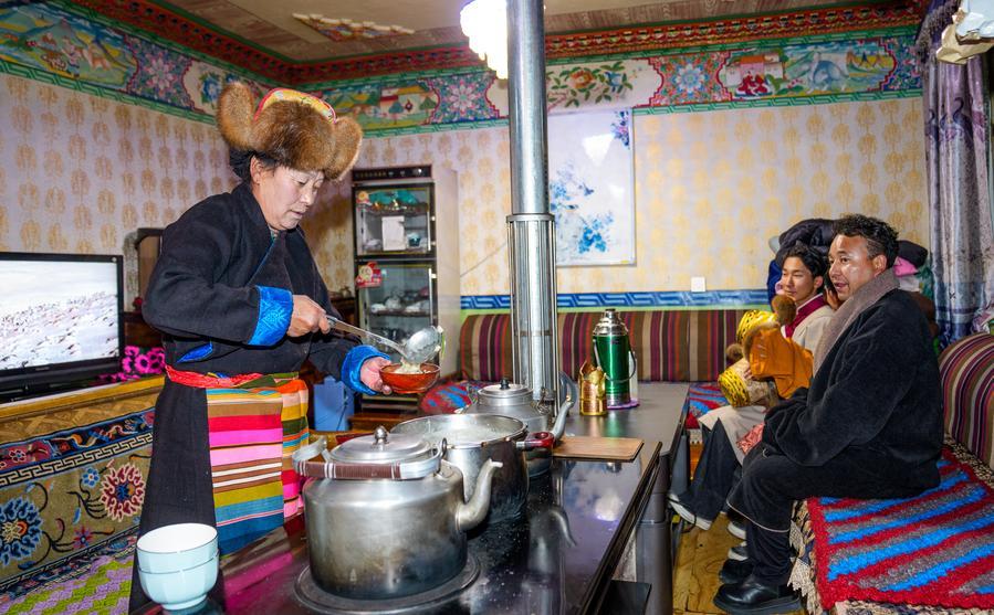 LHASA, Feb. 17 (Xinhua) -- At the Night of Gutu, which falls on the 29th of the 12th month on Tibetan calendar, Chocho and his family cooked "gutu," a kind of soup made of flour, to celebrate this occasion for the gathering of family and relatives.