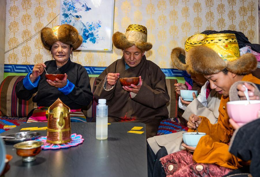 Chocho prepares Tibetan barley liquor at his home in Lhasa, southwest China's Xizang Autonomous Region, Feb. 16, 2026. (Xinhua/Tenzin Nyida)Chocho's grandson Losang Druta wears a traditional Tibetan outfit with a hat to enjoy "gutu" with his family at their home in Lhasa, southwest China's Xizang Autonomous Region, Feb. 16, 2026. (Xinhua/Tenzin Nyida)Chocho's wife Tasang (L) prepares "gutu" at their home in Lhasa, southwest China's Xizang Autonomous Region, Feb. 16, 2026. (Xinhua/Tenzin Nyida)Chocho's family members enjoy "gutu" at their home in Lhasa, southwest China's Xizang Autonomous Region, Feb. 16, 2026. (Xinhua/Tenzin Nyida)