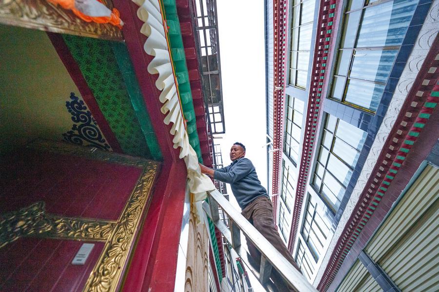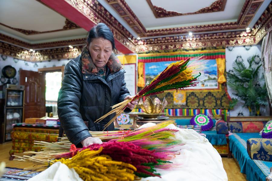 Chocho's wife Tasang arranges Tibetan ceremonial flowers at their home in Lhasa, southwest China's Xizang Autonomous Region, Feb. 16, 2026. (Xinhua/Tenzin Nyida)Chocho prepares a "chema" at his home in Lhasa, southwest China's Xizang Autonomous Region, Feb. 16, 2026. (Xinhua/Tenzin Nyida)A finished "chema" is displayed at Chocho's home in Lhasa, southwest China's Xizang Autonomous Region, Feb. 16, 2026. (Xinhua/Tenzin Nyida)Chocho adorns doors and windows with new Tibetan decorative fabrics as a tradition to celebrate the Tibetan New Year in Lhasa, southwest China's Xizang Autonomous Region, Feb. 16, 2026. (Xinhua/Tenzin Nyida)■