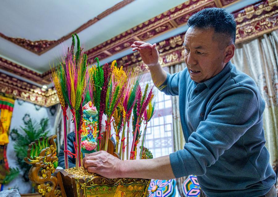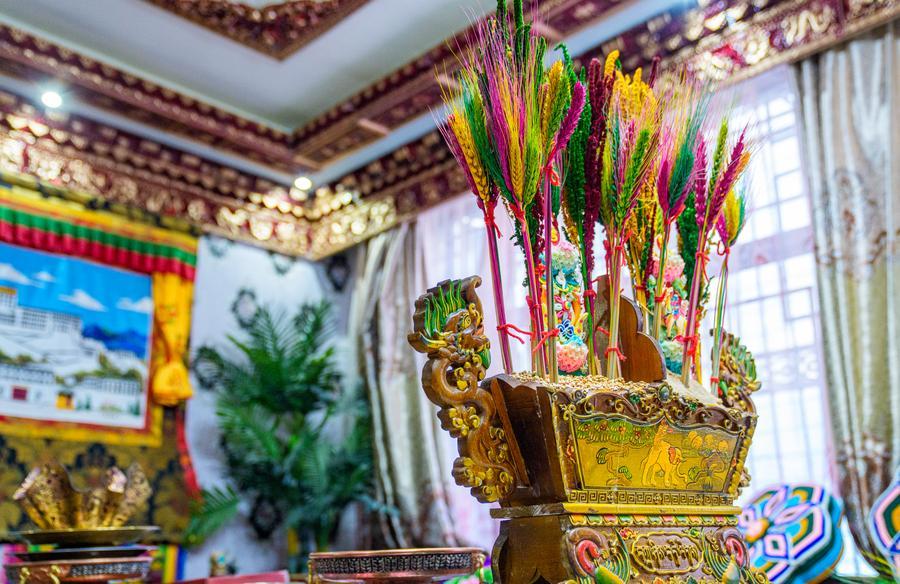 During the celebrations, hosts also fill "chema," a two-tier rectangular wooden box containing roasted barley and fried wheat grain, insert colorful Tibetan ceremonial flowers made of dyed wheat and barley ears, and adorn doors and windows with new decorative fabrics, creating a festive atmosphere to bid farewell to the old year and welcome the new with hope.