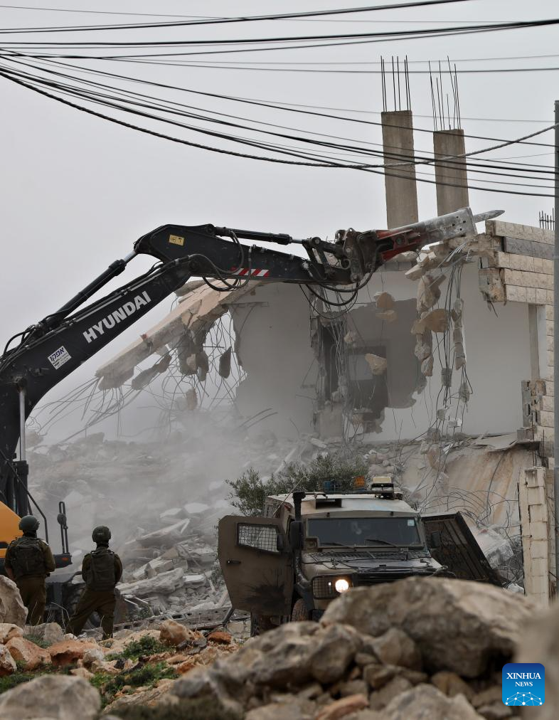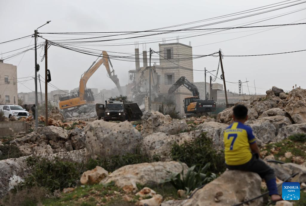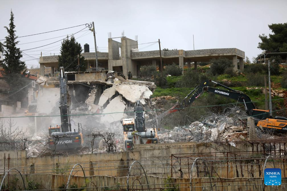 Israeli excavators demolish a building in the town of al-Khader, south of Bethlehem in the West Bank, Feb. 17, 2026. (Photo by Mamoun Wazwaz/Xinhua)