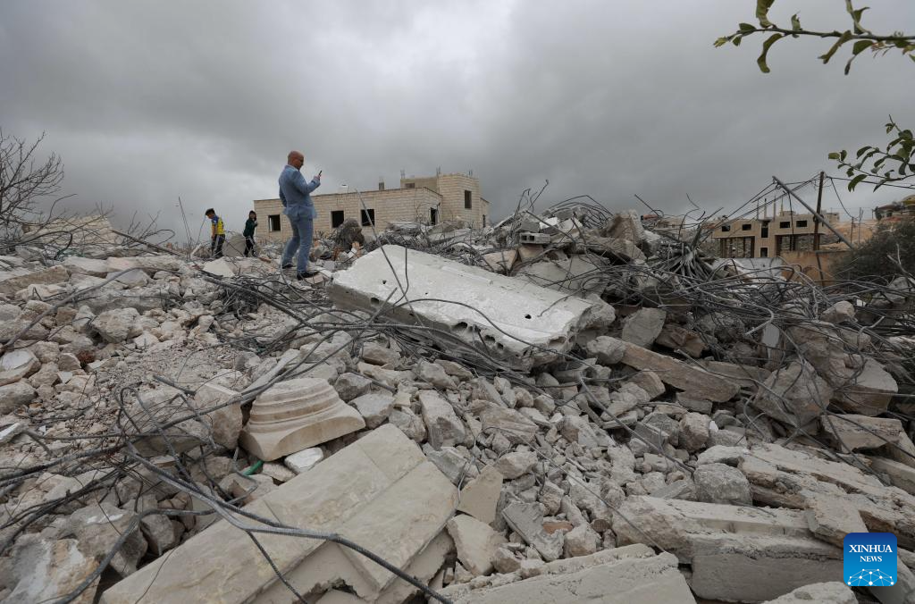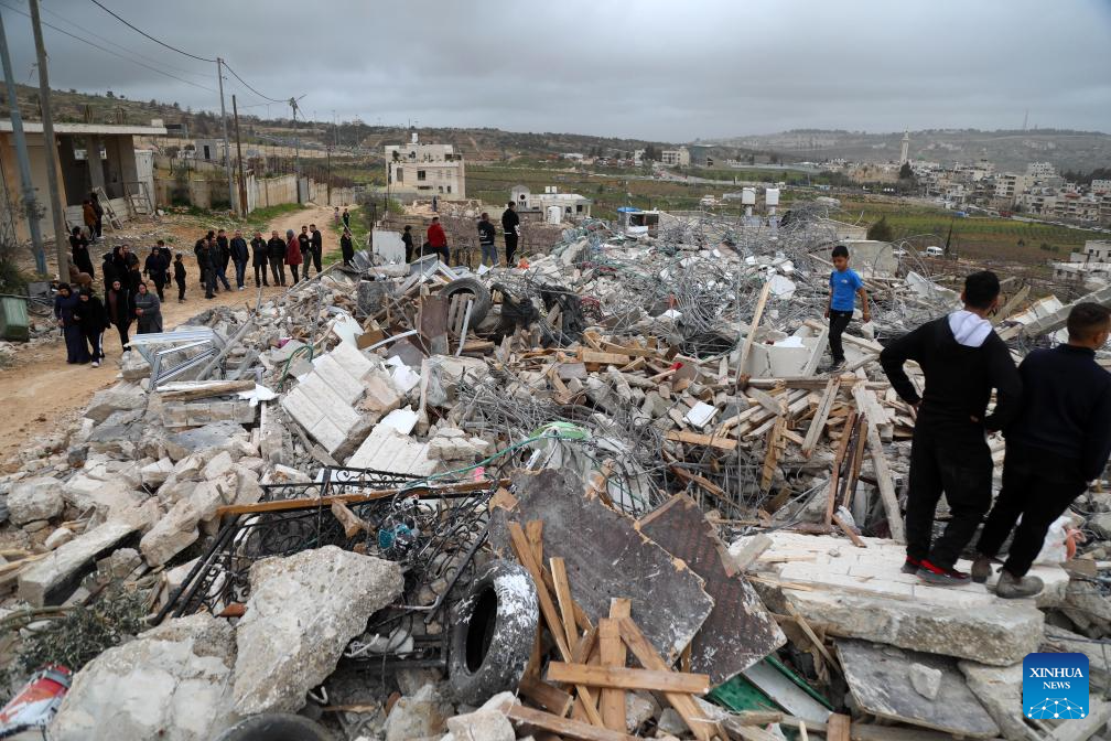 Palestinians inspect the damage after Israeli excavators demolished a building in the town of al-Khader, south of Bethlehem in the West Bank, Feb. 17, 2026. (Photo by Mamoun Wazwaz/Xinhua)