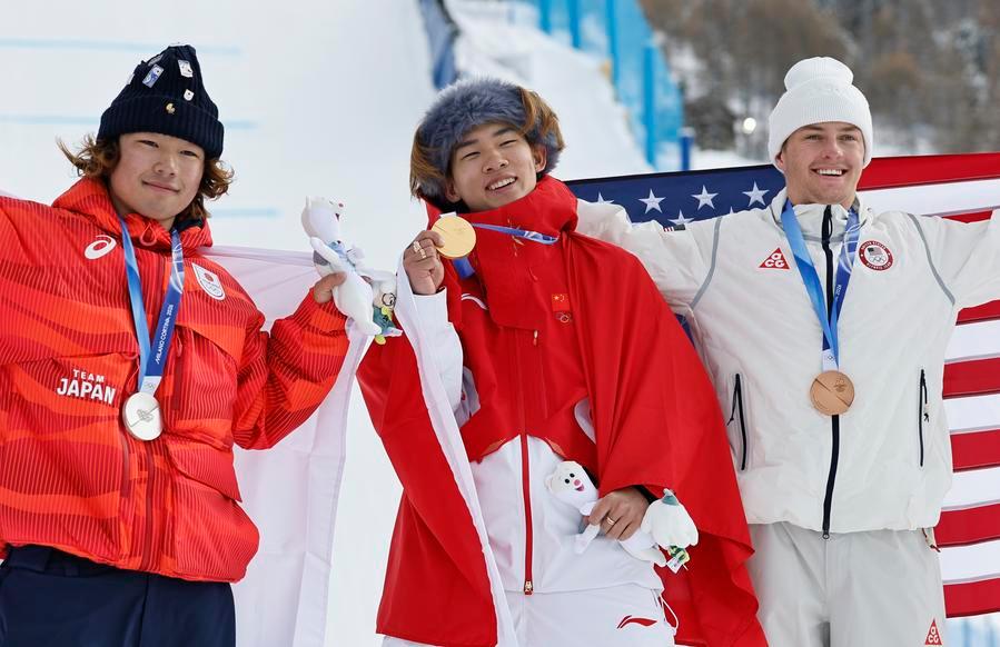 LIVIGNO, Italy, Feb. 18 (Xinhua) -- Su Yiming captured gold in the men's snowboard slopestyle final at the Milan-Cortina Winter Olympics here on Wednesday, delivering China's first gold medal of the Games.