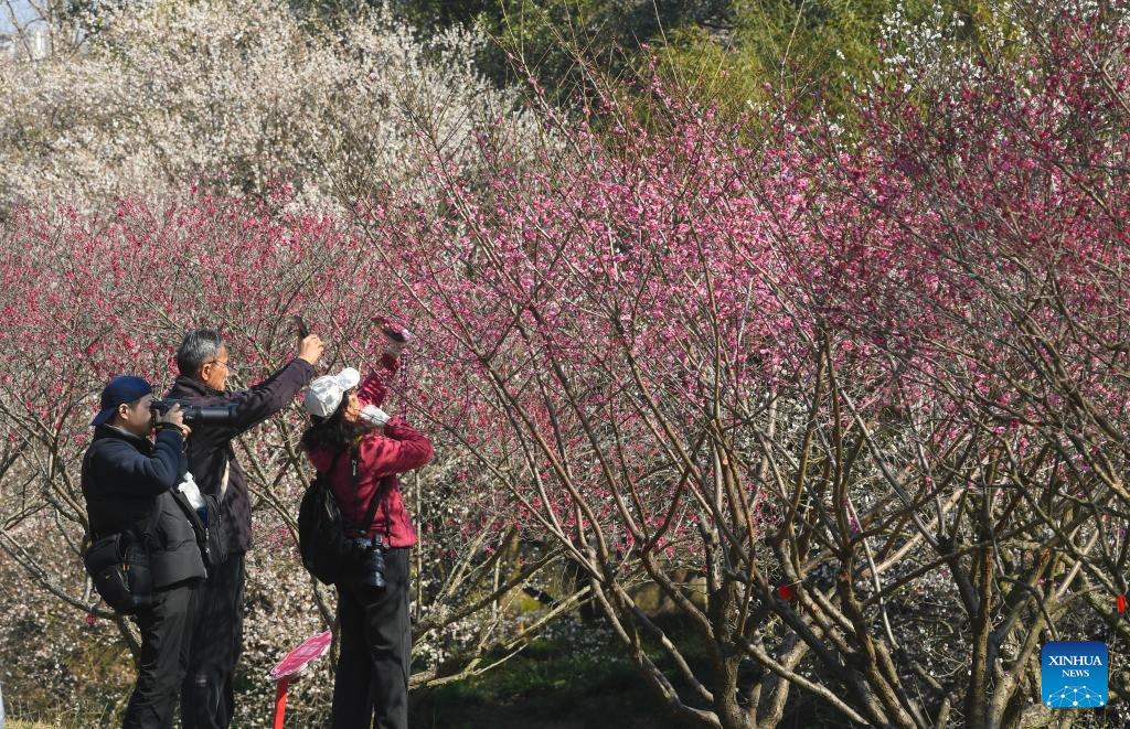 Visitors take photos of plum blossoms at the Xixi National Wetland Park in Hangzhou, east China's Zhejiang Province, Feb. 18, 2026. The Xixi wetland has entered the best season for viewing plum blossoms during the Spring Festival holiday. (Xinhua/Weng Xinyang)