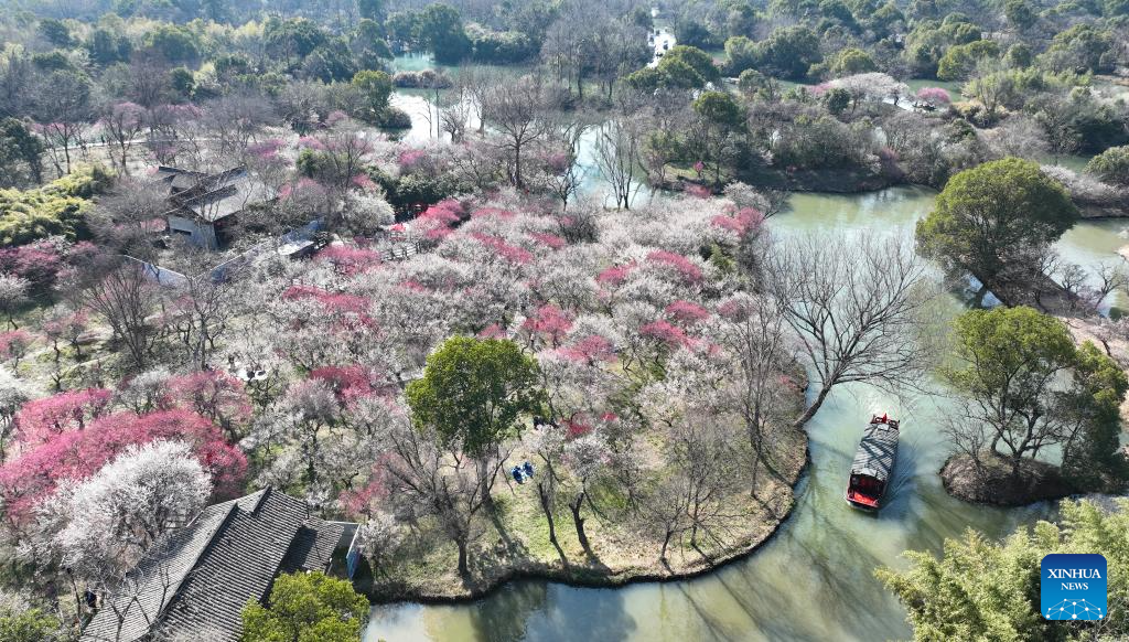 An aerial drone photo taken on Feb. 18, 2026 shows visitors taking boat trips to enjoy plum blossoms at the Xixi National Wetland Park in Hangzhou, east China's Zhejiang Province. The Xixi wetland has entered the best season for viewing plum blossoms during the Spring Festival holiday. (Xinhua/Weng Xinyang)