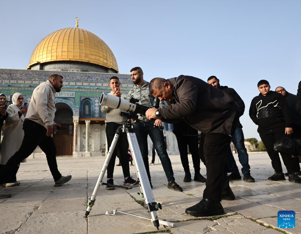 A Palestinian observes the moon through a telescope ahead of the holy month of Ramadan at Al-Aqsa Mosque compound in the Old City of Jerusalem, Feb. 17, 2026. (Photo by Jamal Awad/Xinhua)