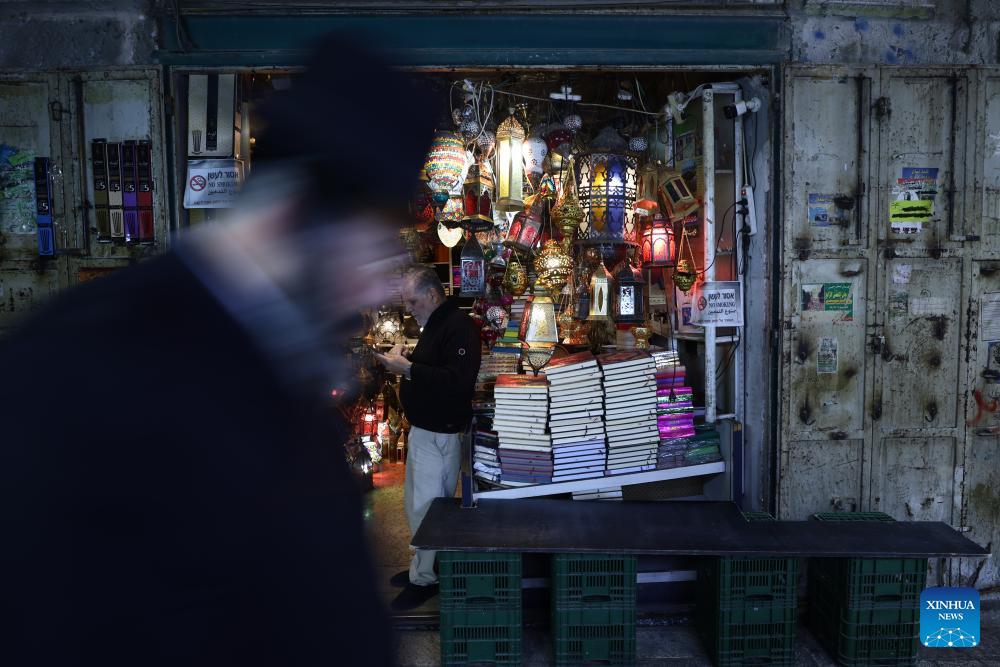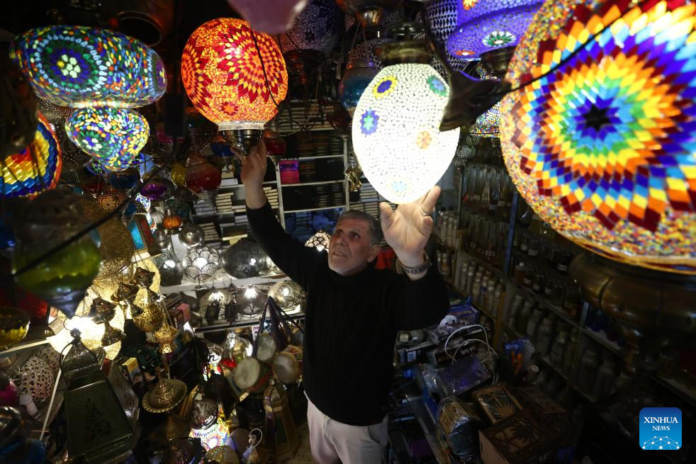 A Palestinian shopkeeper lights up Ramadan lanterns in the Old City of Jerusalem to welcome the upcoming holy month of Ramadan, Feb. 17, 2026. (Photo by Jamal Awad/Xinhua)