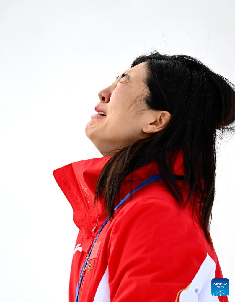 Gold medalist Xu Mengtao of China reacts during the awarding ceremony for the freestyle skiing women's aerials at the Milan-Cortina 2026 Olympic Winter Games in Livigno, Italy, Feb. 18, 2026. (Xinhua/Zhang Hongxiang)