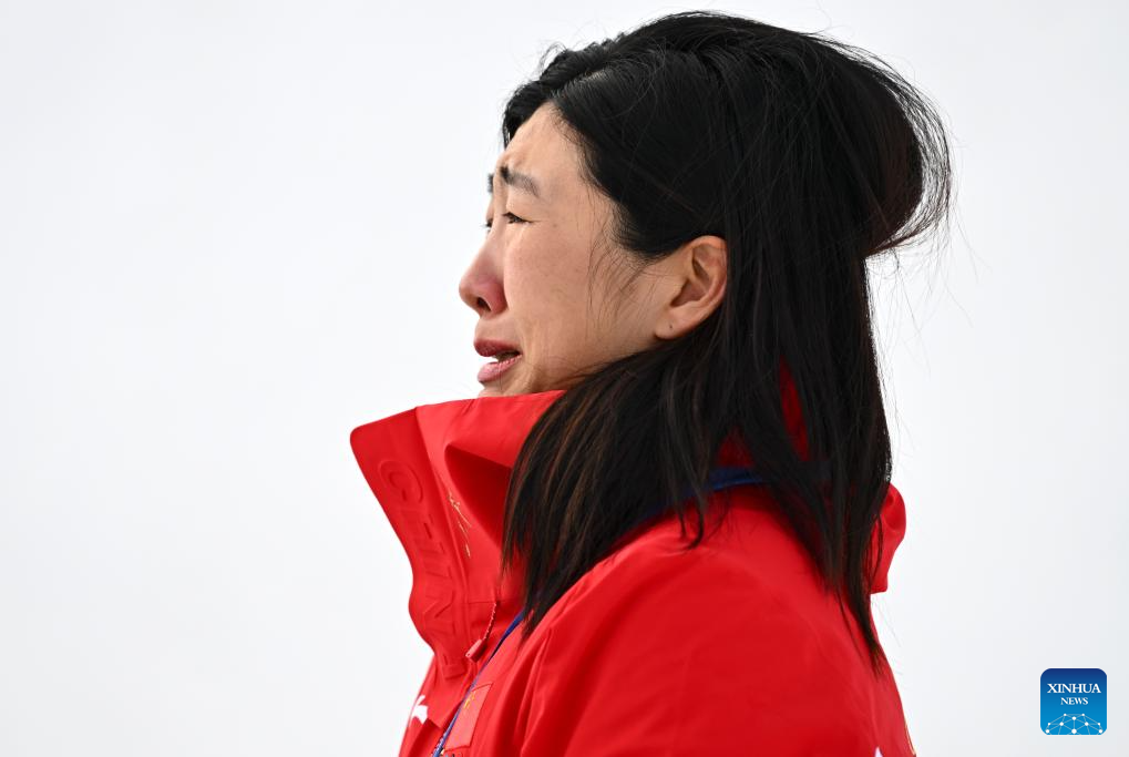 Xu Mengtao of China reacts after the freestyle skiing women's aerials final 2 at the Milan-Cortina 2026 Olympic Winter Games in Livigno, Italy, Feb. 18, 2026. (Xinhua/Zhang Hongxiang)