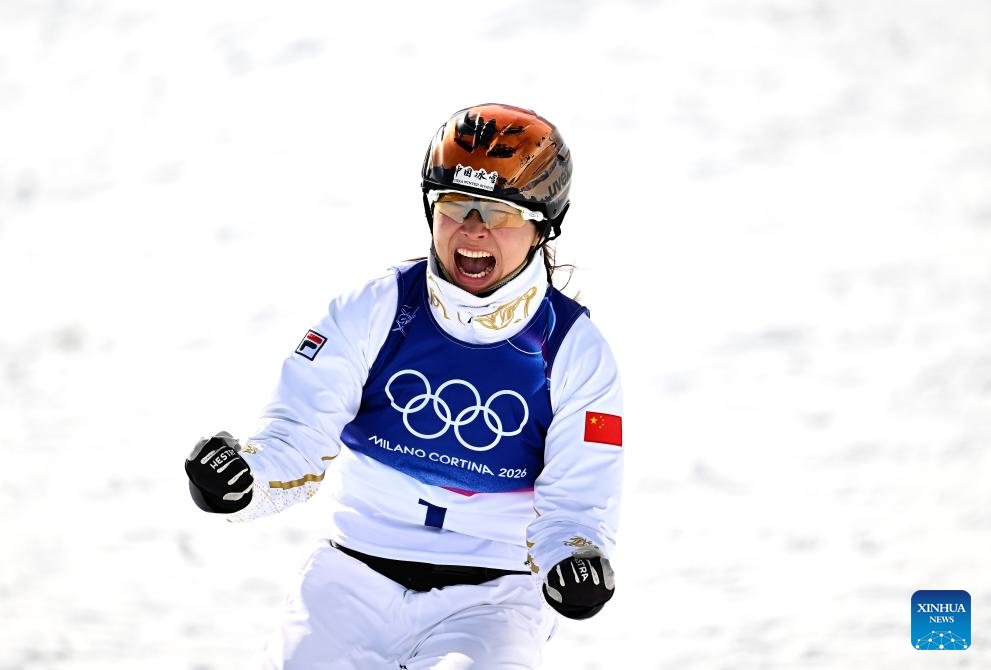 Xu Mengtao of China celebrates after the freestyle skiing women's aerials final 2 at the Milan-Cortina 2026 Olympic Winter Games in Livigno, Italy, Feb. 18, 2026. (Xinhua/Wu Huiwo)
