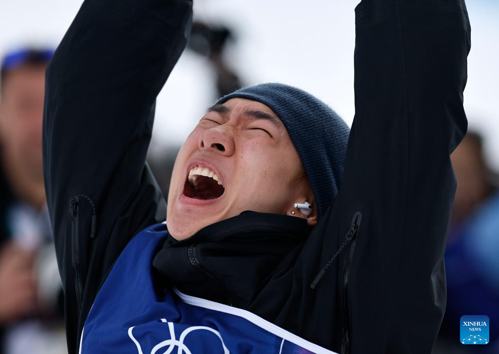 Su Yiming of China celebrates after the snowboard men's snowboard slopestyle final at the Milan-Cortina 2026 Olympic Winter Games in Livigno, Italy, Feb. 18, 2026. (Xinhua/Wang Peng)