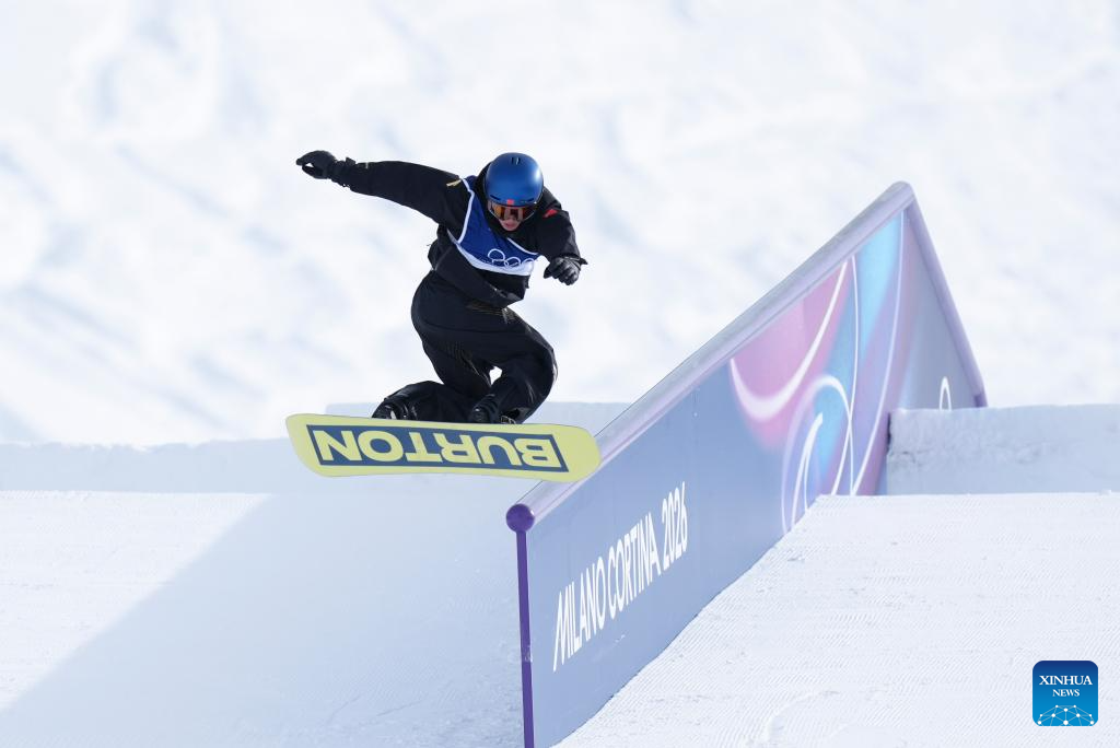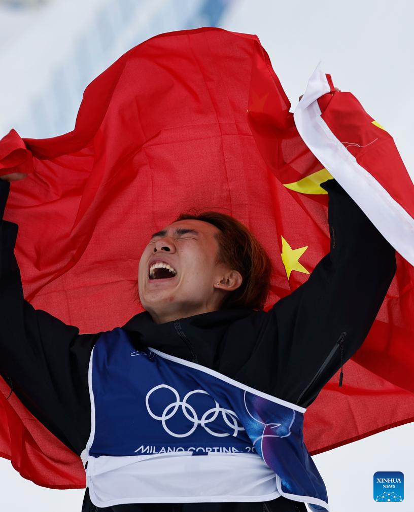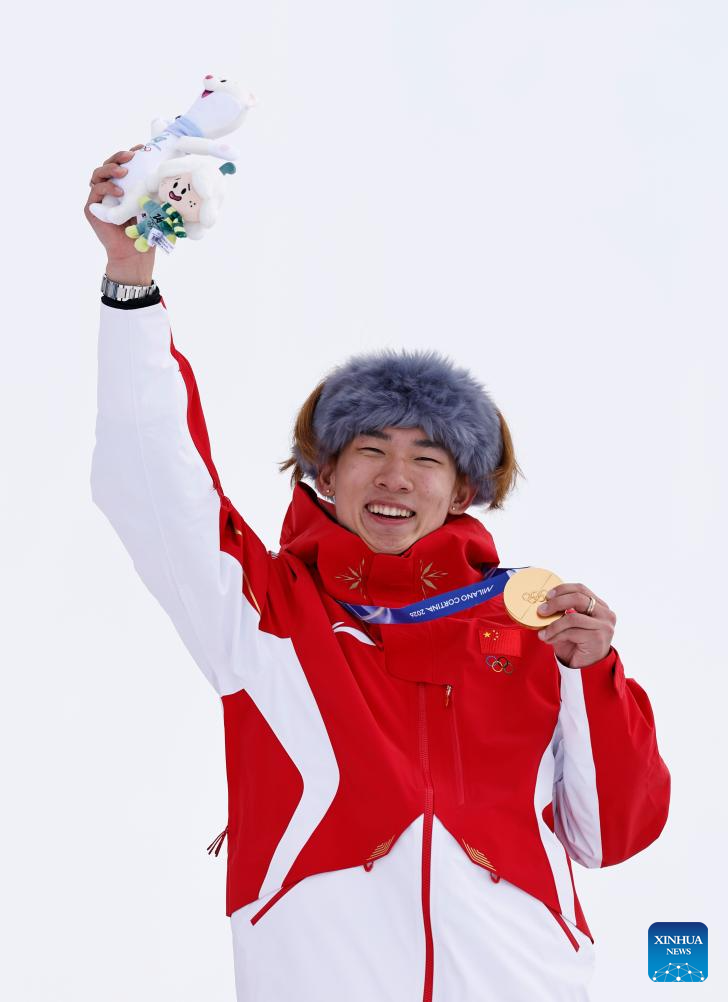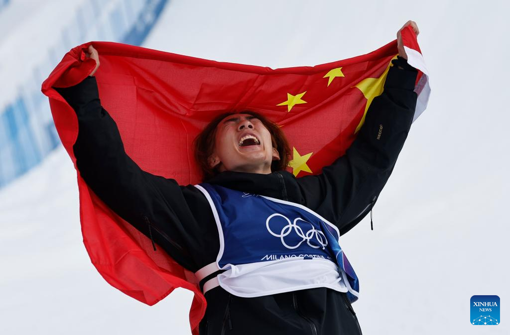 LIVIGNO, Italy, Feb. 18 (Xinhua) -- Su Yiming captured gold in the men's snowboard slopestyle final at the Milan-Cortina Winter Olympics on Wednesday, delivering the first gold medal for China at the Games.