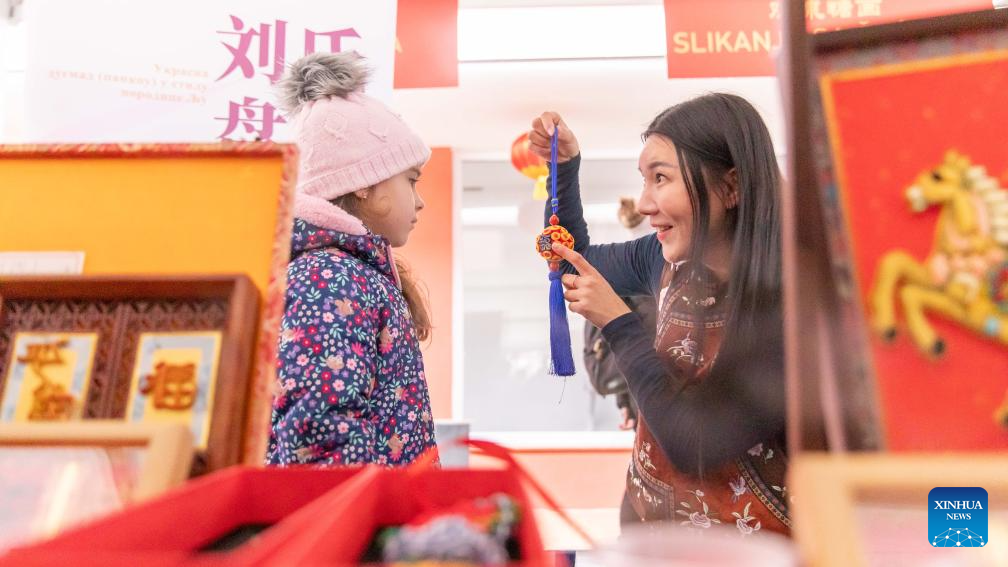 A Chinese artist introduces Chinese intangible cultural heritage works to a girl during an event celebrating the Spring Festival in Belgrade, Serbia, Feb. 17, 2026. A series of events celebrating the Spring Festival were held here on Monday and Tuesday, creating a festive atmosphere and attracting thousands of local residents and members from the Chinese community. (Photo by Wang Wei/Xinhua)