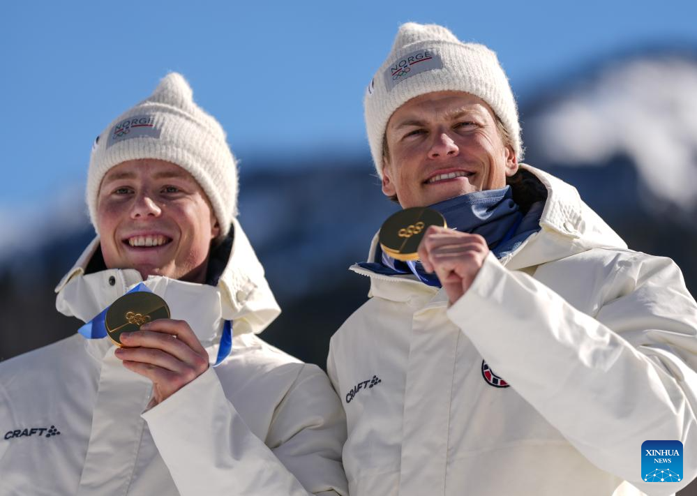 Gold medalists Einar Hedegart and Johannes Hoesflot Klaebo of Norway pose during the awarding ceremony for the cross-country skiing men's team sprint free at the Milan-Cortina 2026 Olympic Winter Games in Tesero, Italy, Feb. 18, 2026. (Xinhua/Peng Ziyang)