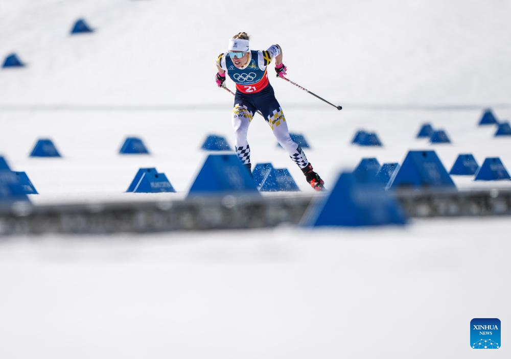 Jonna Sundling of Sweden competes during the cross-country skiing women's team sprint free final at the Milan-Cortina 2026 Olympic Winter Games in Tesero, Italy, Feb. 18, 2026. (Xinhua/Peng Ziyang)