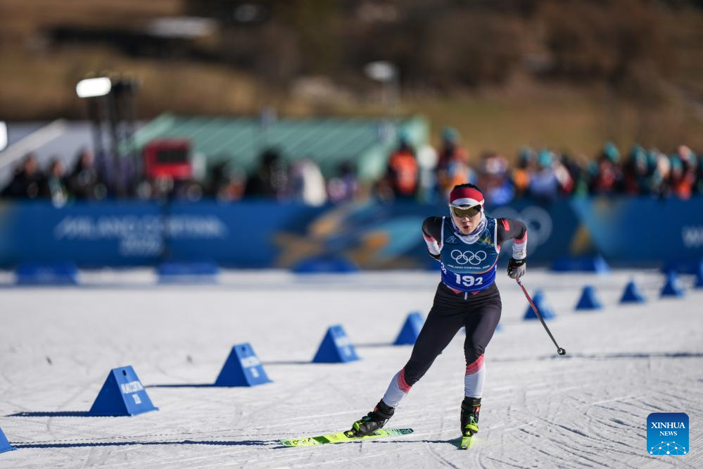 Chi Chunxue of China competes during the cross-country skiing women's team sprint free final at the Milan-Cortina 2026 Olympic Winter Games in Tesero, Italy, Feb. 18, 2026. (Xinhua/Peng Ziyang)