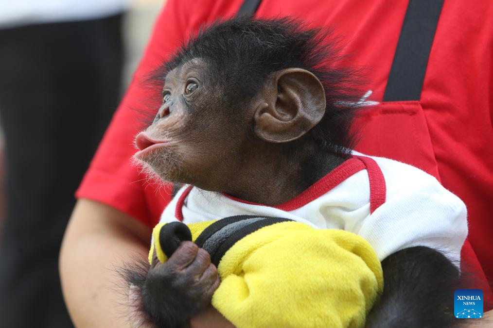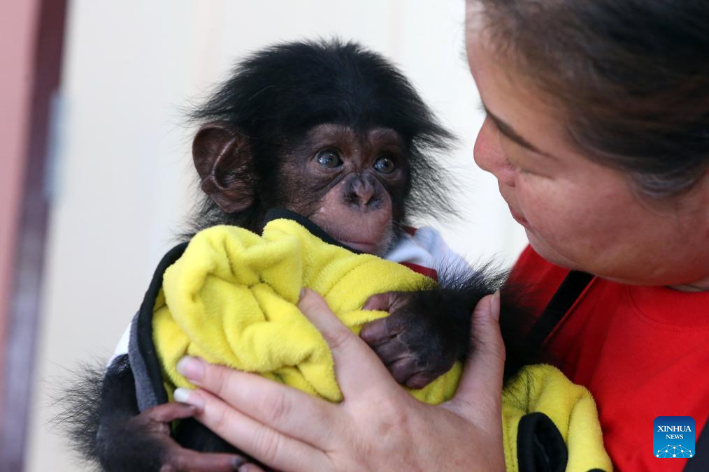 A baby chimpanzee is seen at Samut Prakan Crocodile Farm and Zoo in Samut Prakan province, Thailand, Feb. 17, 2026. (Xinhua/Rachen Sageamsak)