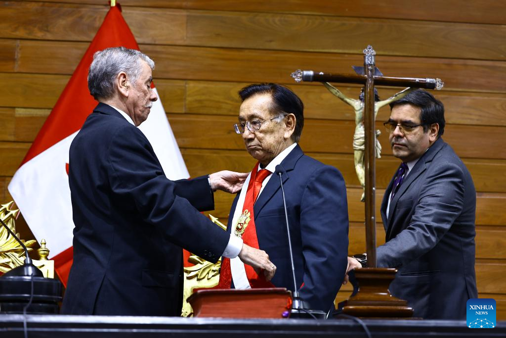 Jose Balcazar (C) receives the presidential sash at the Congress of the Republic of Peru, in Lima, Peru, on Feb. 18, 2026. Peru's Congress on Wednesday elected lawmaker Jose Balcazar as its new leader, who assumes the country's presidency under constitution. Balcazar was sworn in as Peruvian president shortly after the vote. His term will run through July 28, 2026, in accordance with the current presidential mandate. (Peru's Congress/Handout via Xinhua)