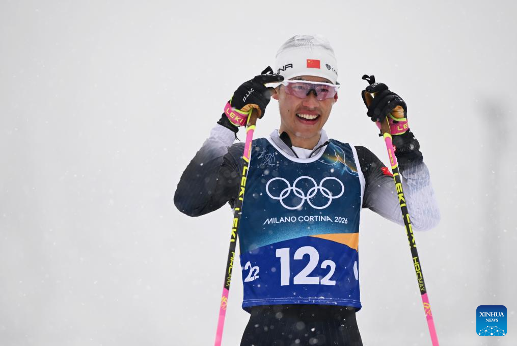 Zhao Jiawen of China reacts after the cross-country event of the nordic combined team sprint at the 2026 Milan-Cortina Winter Olympics in Tesero, Italy, Feb. 19, 2026. (Xinhua/He Canling)