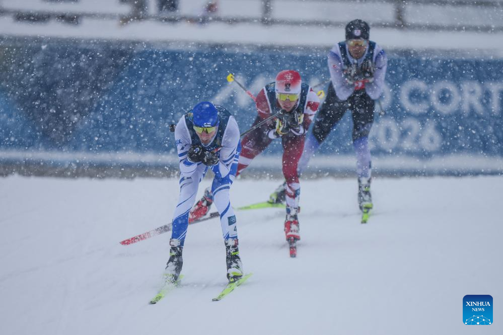 Athletes compete during the cross-country event of the nordic combined team sprint at the 2026 Milan-Cortina Winter Olympics in Tesero, Italy, Feb. 19, 2026. (Xinhua/Peng Ziyang)