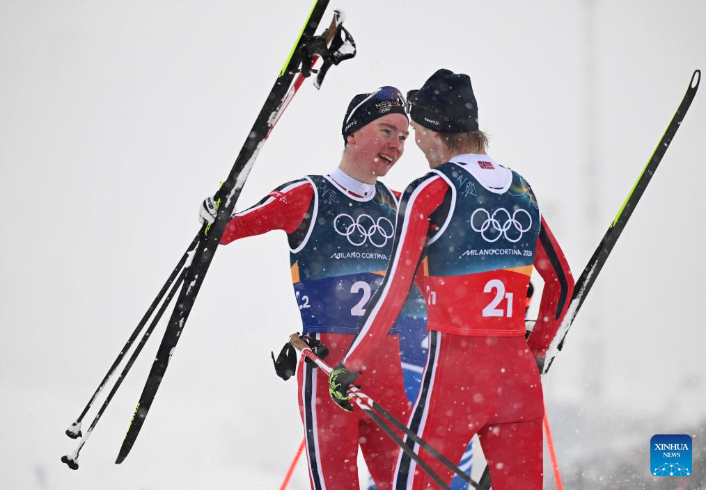 TESERO, Italy, Feb. 19 (Xinhua) -- A nail-biting sprint to the finish decided the men's Nordic combined team sprint on Thursday as Norway's Jens Luraas Oftebro and Andreas Skoglund claimed gold at the Milan-Cortina Winter Olympics.