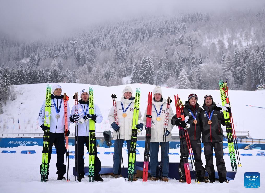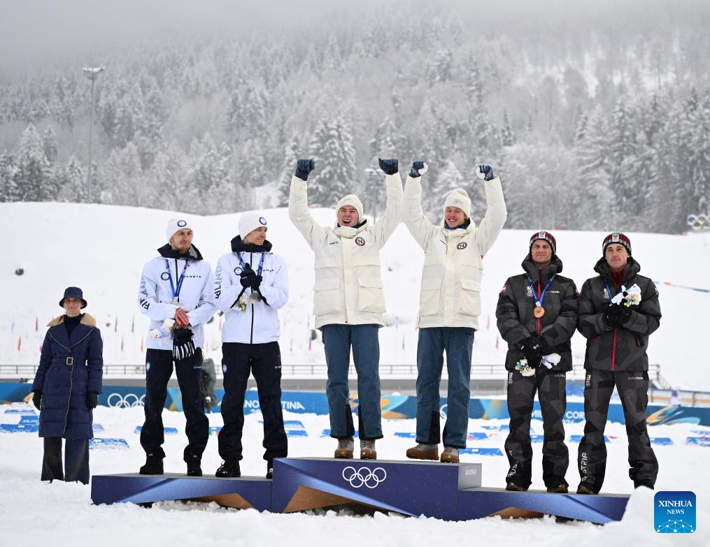 Gold medalists Jens Luraas Oftebro and Andreas Skoglund of Norway, silver medalists Ilkka Herola and Eero Hirvonen of Finland, and bronze medalists Stefan Rettenegger and Johannes Lamparter of Austria pose for photos during the awarding ceremony of the nordic combined team sprint at the 2026 Milan-Cortina Winter Olympics in Tesero, Italy, Feb. 19, 2026. (Xinhua/He Canling)
