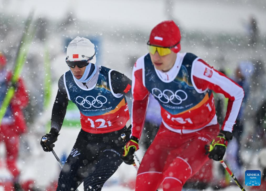 Zhao Zihe (L) of China competes during the cross-country event of the nordic combined team sprint at the 2026 Milan-Cortina Winter Olympics in Tesero, Italy, Feb. 19, 2026. (Xinhua/He Canling)