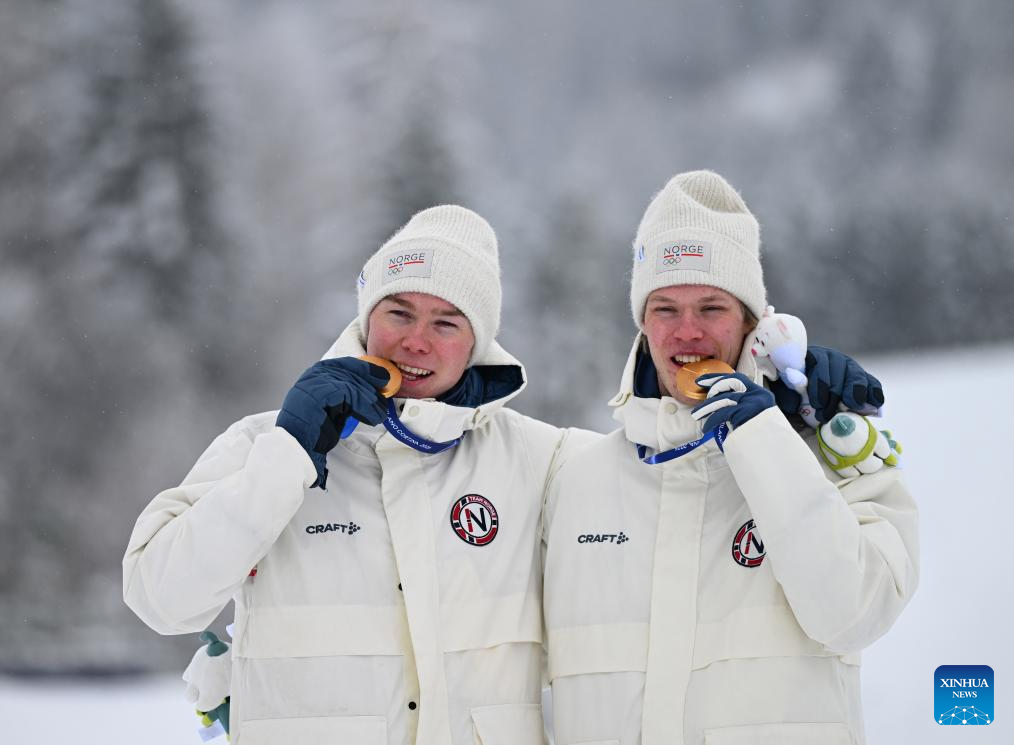 Gold medalists Jens Luraas Oftebro and Andreas Skoglund of Norway pose for photos during the awarding ceremony of the nordic combined team sprint at the 2026 Milan-Cortina Winter Olympics in Tesero, Italy, Feb. 19, 2026. (Xinhua/He Canling)