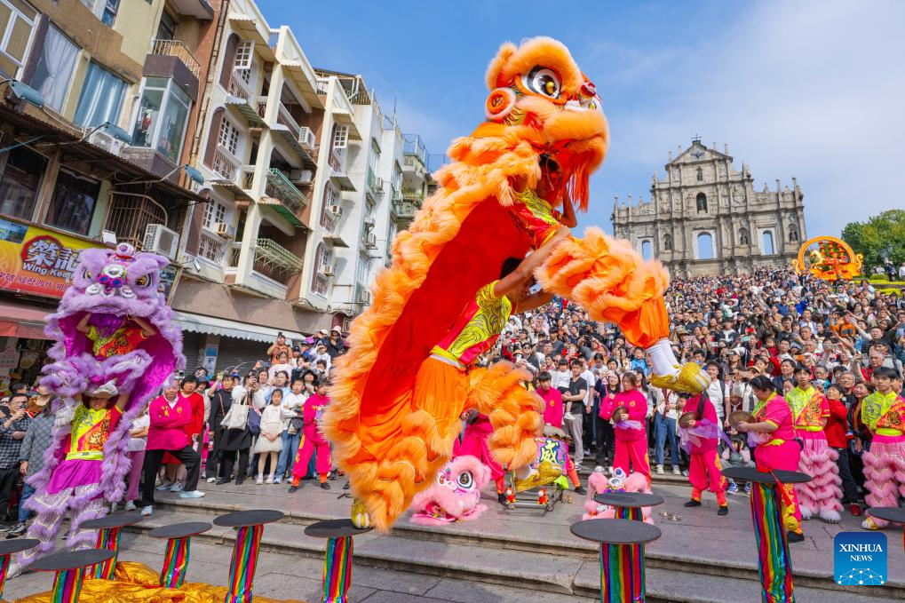 Lion dancers perform during a celebration of the Spring Festival in front of the Ruins of St. Paul's in south China's Macao, Feb. 18, 2026. (Xinhua/Cheong Kam Ka)