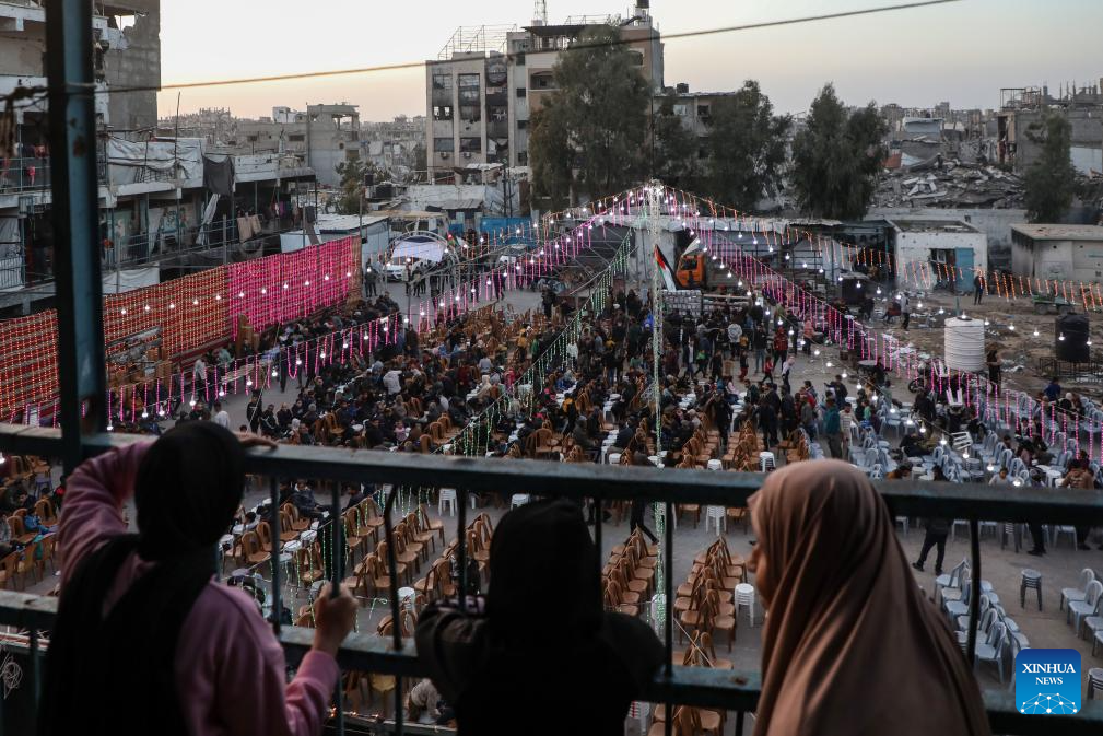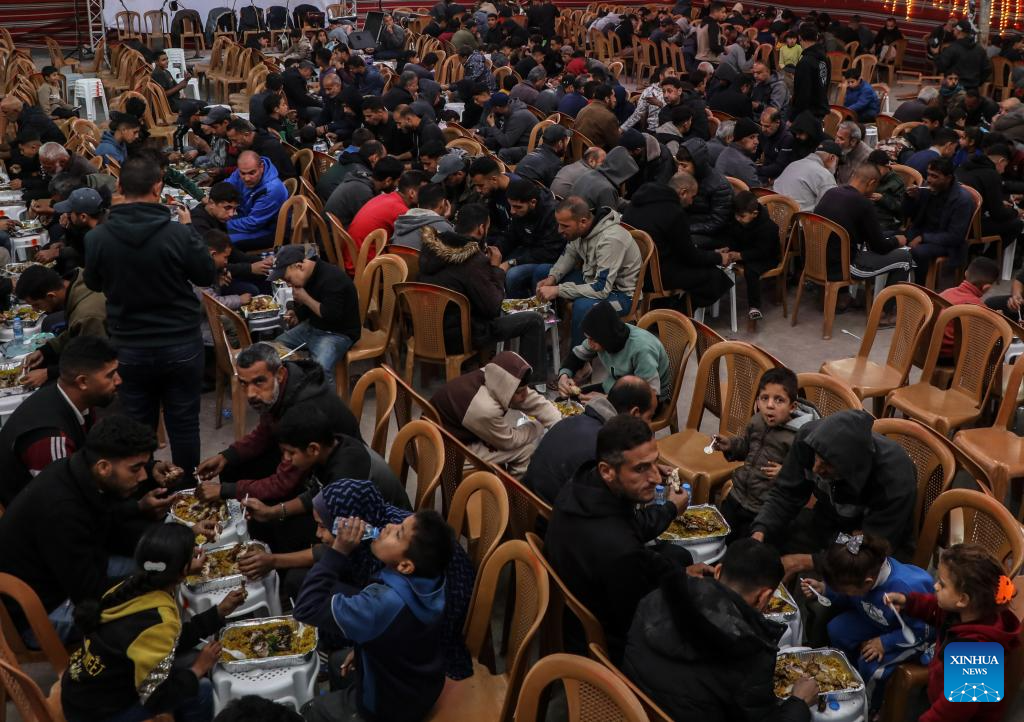 Palestinians attend a group meal on the first day of Ramadan inside a school-turned shelter in Beit Lahia, northern Gaza Strip, on Feb. 18, 2026. (Photo by Rizek Abdeljawad/Xinhua)