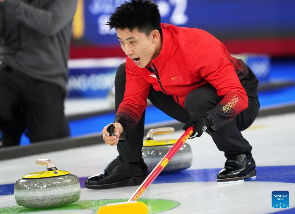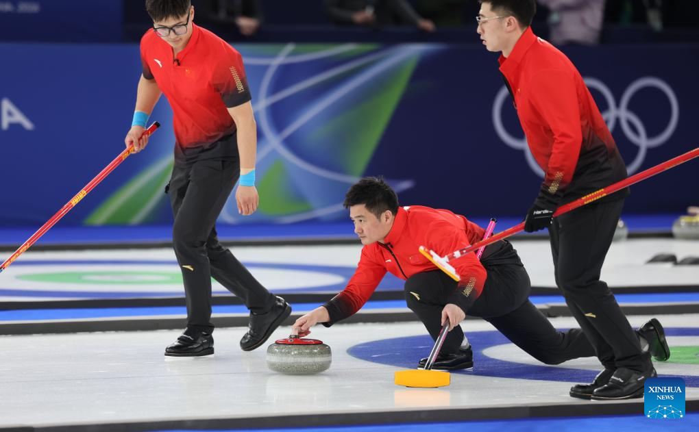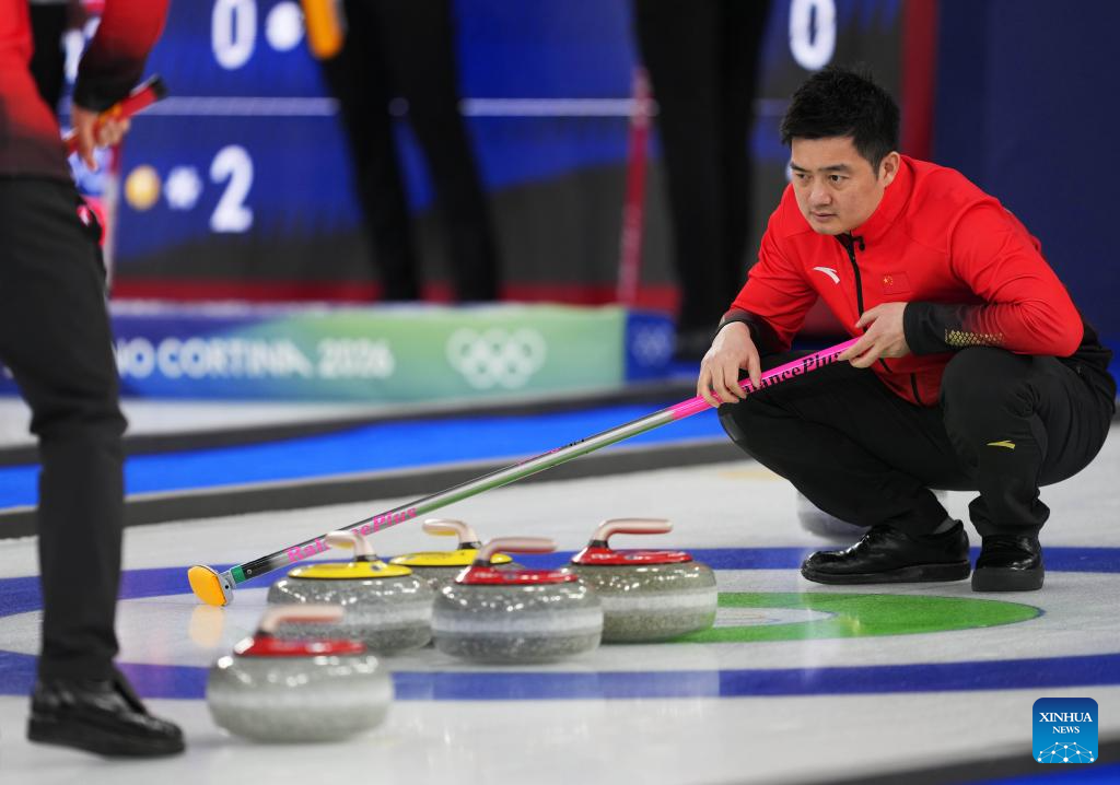 Xu Xiaoming of China competes during the curling men's round robin session 11 match between the Czech Republic and China at the 2026 Milan-Cortina Winter Olympics in Cortina, Italy, Feb. 18, 2026. (Xinhua/Li Gang)