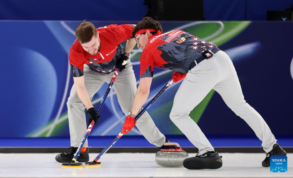 Aidan Oldenburg (R) and Ben Richardson of the United States compete during the curling men's round robin session 11 match between Britain and the United States at the 2026 Milan-Cortina Winter Olympics in Cortina, Italy, Feb. 18, 2026. (Xinhua/Ding Xu)