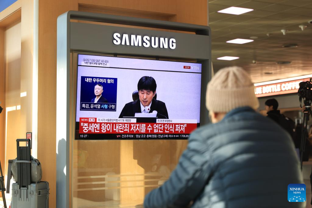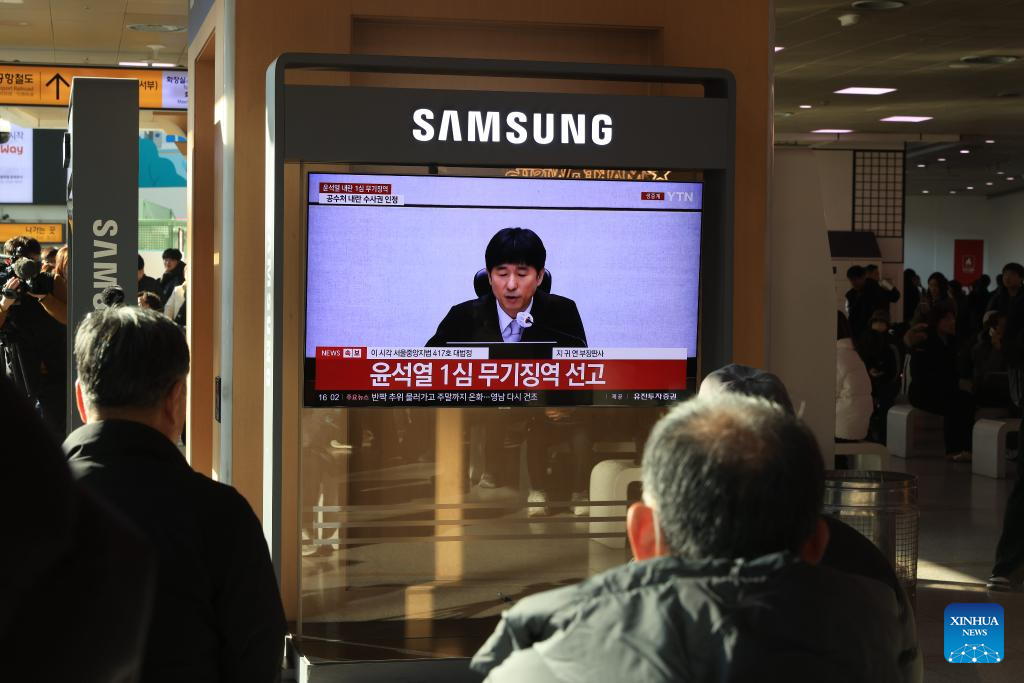 People watch a televised news report on Yoon Suk-yeol's court trial at Seoul Railway Station in Seoul, South Korea, Feb. 19, 2026. South Korea's former President Yoon Suk-yeol was sentenced to life in prison on charges of insurrection stemming from his declaration of emergency martial law, live footage showed Thursday.The Seoul Central District Court delivered its ruling, which was broadcast live to the public, saying the crux of Yoon's martial law case was the fact that troops were deployed to the National Assembly. (Photo by Park Jintaek/Xinhua)