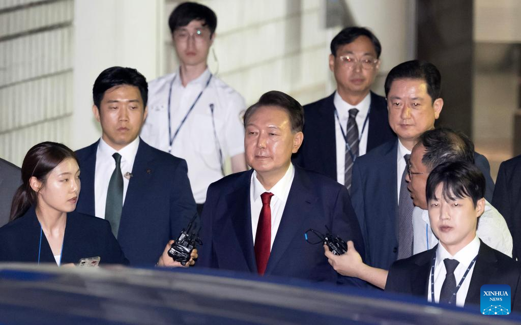 This file photo shows South Korea's former President Yoon Suk-yeol after a hearing in Seoul, South Korea, July 9, 2025. South Korea's former President Yoon Suk-yeol was sentenced to life in prison on charges of insurrection stemming from his declaration of emergency martial law, live footage showed Thursday. The Seoul Central District Court delivered its ruling, which was broadcast live to the public, saying the crux of Yoon's martial law case was the fact that troops were deployed to the National Assembly. (NEWSIS/Handout via Xinhua)
