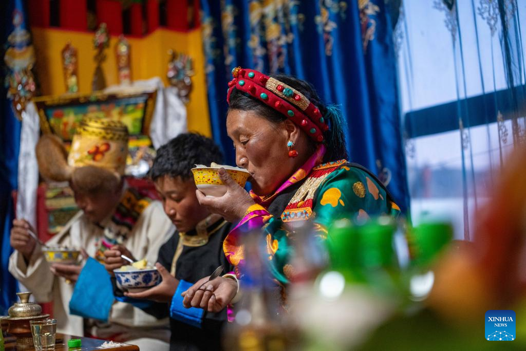 Sangs-rgyas (1st, R) enjoys "gutu," a kind of soup made of flour, with his family at home in Gurum Village of Chamco Township, Dingri County, southwest China's Xizang Autonomous Region, Feb. 16, 2026. "Gu" in Tibetan means nine and "Tu" means pasta. At the Night of Gutu, the whole family and relatives gather to enjoy the dish and celebrate the occasion.