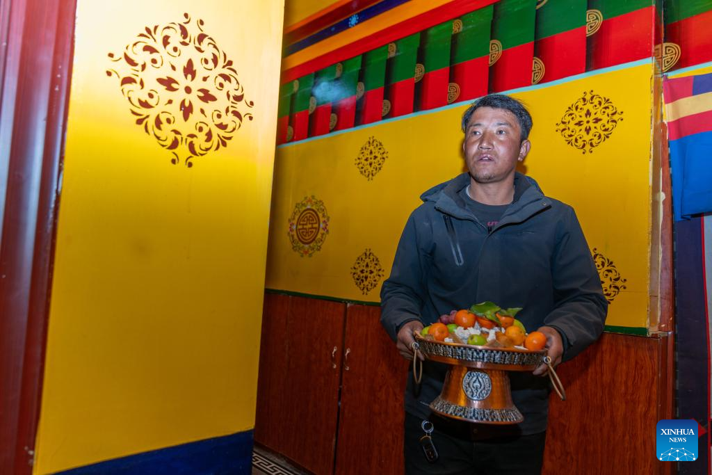 Sangs-rgyas prepares fruits for new year celebration at home in Gurum Village of Chamco Township, Dingri County, southwest China's Xizang Autonomous Region, Feb. 16, 2026.