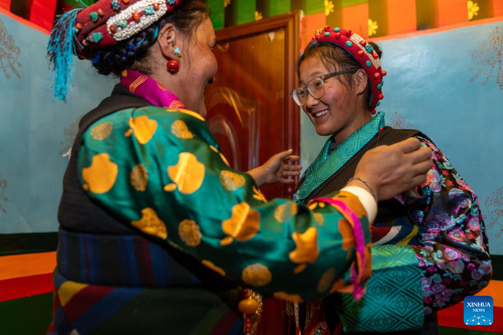 Drolma Tsering (L) arranges clothes for her daughter Tenzin Wangmo at home in Gurum Village of Chamco Township, Dingri County, southwest China's Xizang Autonomous Region, Feb. 16, 2026.