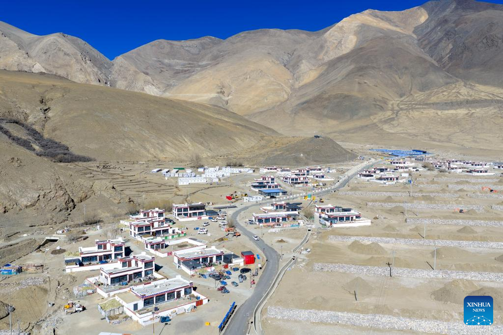 An aerial drone photo taken on Feb. 16, 2026 shows a view of the houses reconstructed after earthquake in Gurum Village of Chamco Township, Dingri County, southwest China's Xizang Autonomous Region.