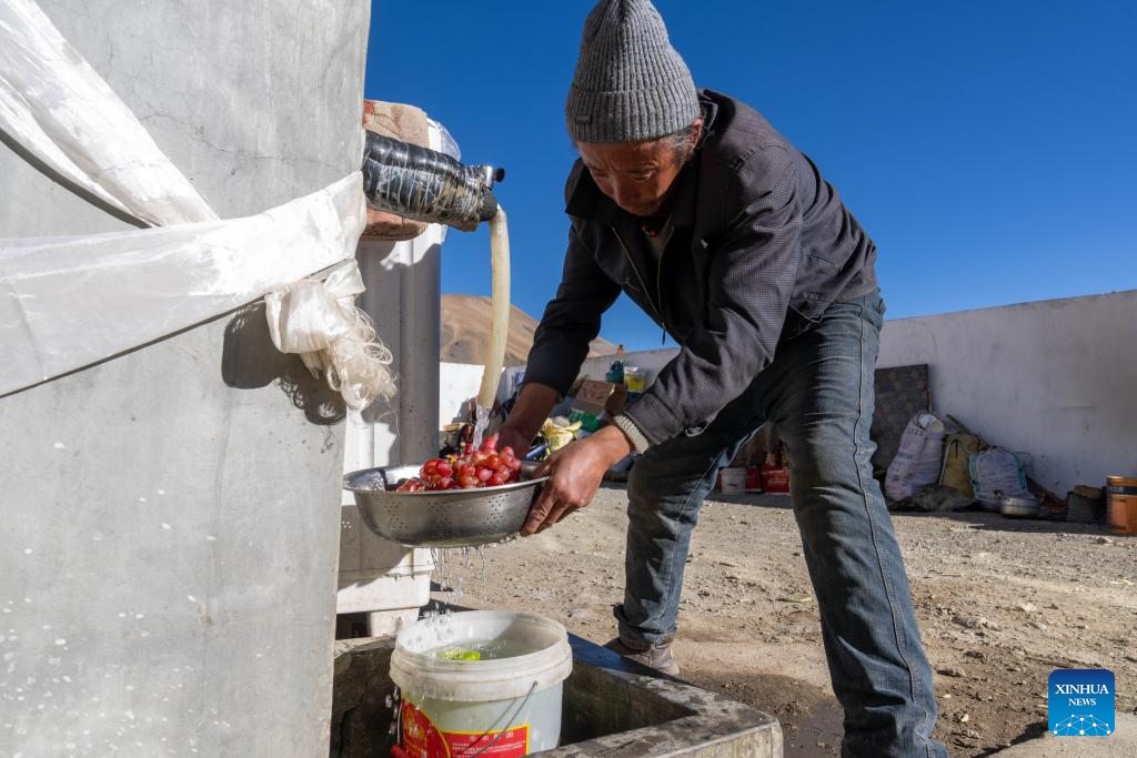 Migmar, brother of Sangs-rgyas, washes fruits at Sangs-rgyas's home in Gurum Village of Chamco Township, Dingri County, southwest China's Xizang Autonomous Region, Feb. 16, 2026.