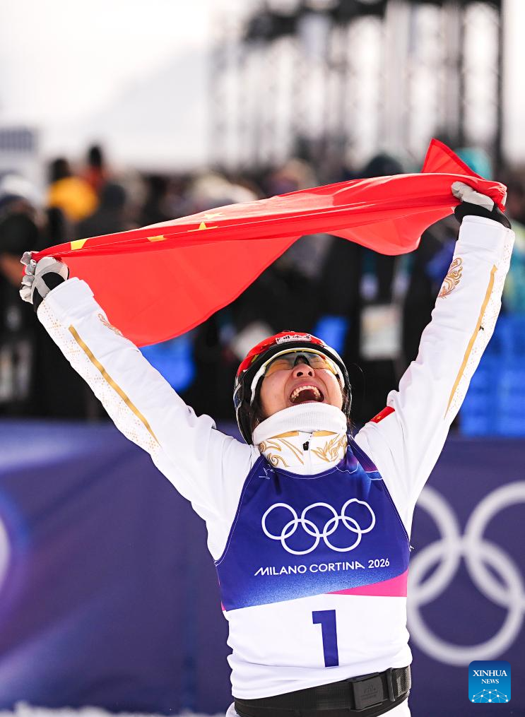 Xu Mengtao of China celebrates after the freestyle skiing women's aerials final 2 at the Milan-Cortina 2026 Olympic Winter Games in Livigno, Italy, Feb. 18, 2026. (Xinhua/Wu Huiwo)