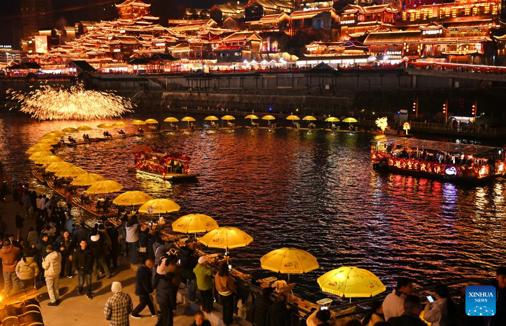A molten iron fireworks show is staged on water at a botanical garden in Luoyang City, central China's Henan Province, Feb. 17, 2026. During the Spring Festival, lantern decorations across the country created a joyful atmosphere for the holiday. (Photo by Huang Zhengwei/Xinhua)