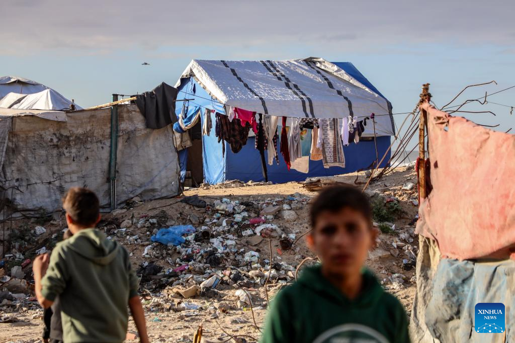 Palestinian children are seen near tents for displaced people in west of Gaza City, on Feb. 19, 2026. The United Nations Relief and Works Agency for Palestine Refugees in the Near East warned on Thursday that the humanitarian situation in the Gaza Strip is "dire" as restrictions on aid access continue. (Photo by Rizek Abdeljawad/Xinhua)