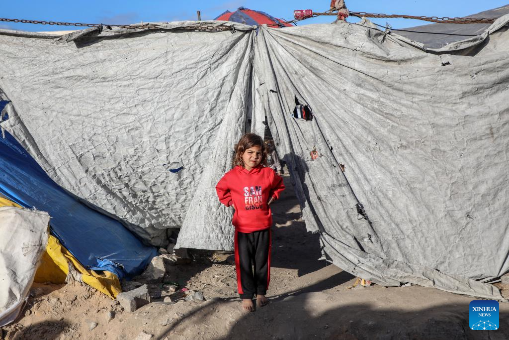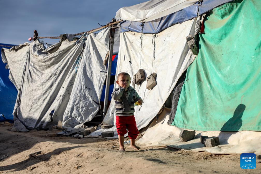 A Palestinian child is pictured near tents for displaced people in west of Gaza City, on Feb. 19, 2026. The United Nations Relief and Works Agency for Palestine Refugees in the Near East warned on Thursday that the humanitarian situation in the Gaza Strip is "dire" as restrictions on aid access continue. (Photo by Rizek Abdeljawad/Xinhua)