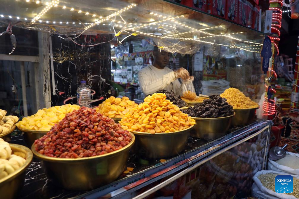 A seller arranges dried fruit on the first day of Ramadan at a market in Cairo, Egypt, on Feb. 19, 2026. (Xinhua/Ahmed Gomaa)